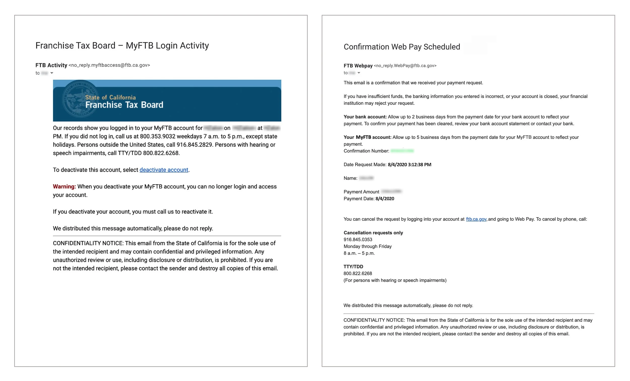 I received two emails from the California Franchise Tax Board (CA FTB) related to activity on their payment platform, MyFTB.