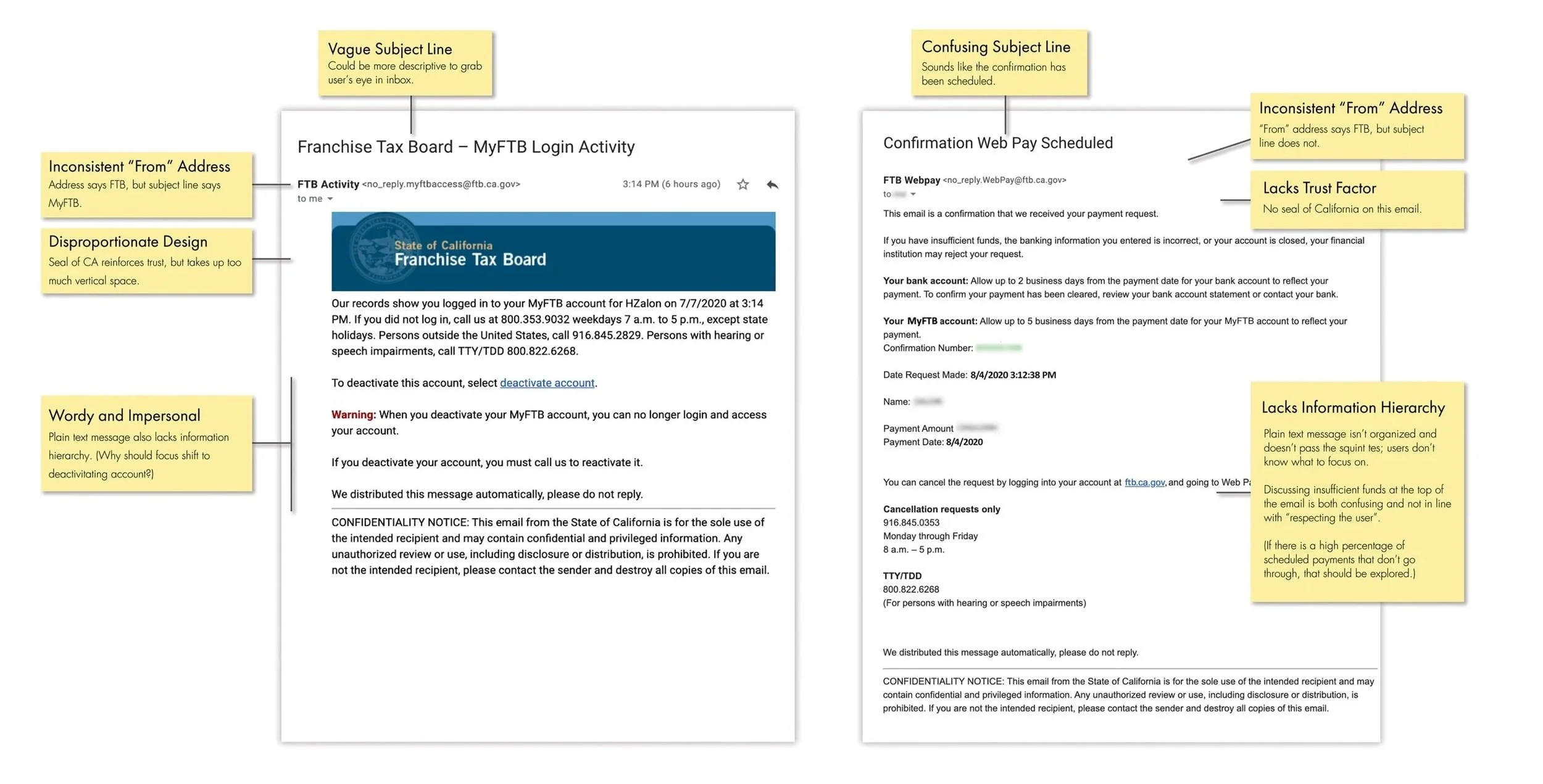 These changes aim to make the emails easier to recognize in the inbox, improve readability, and create a sense of familiarity through repeated structure. Most importantly, they’re designed to instill confidence in the security of users’ tax-related activity, and build greater trust in the California Franchise Tax Board’s digital communications.